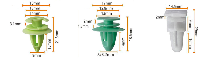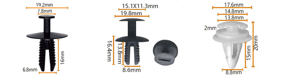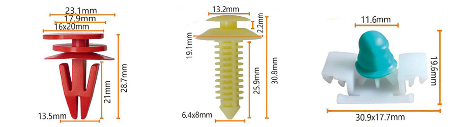 Plastist kiirväljaande klambrid: kasutatakse kerepaneelide, kaitseraudade, rattakaare vooderdiste ja nii edasi. Need klambrid on tavaliselt valmistatud kõrge temperatuuriga vastupidavast, ülitugevast plastist ja need on konstrueeritud kiire väljalaskefunktsiooniga, muutes osade parandamise või asendamise hõlpsaks.